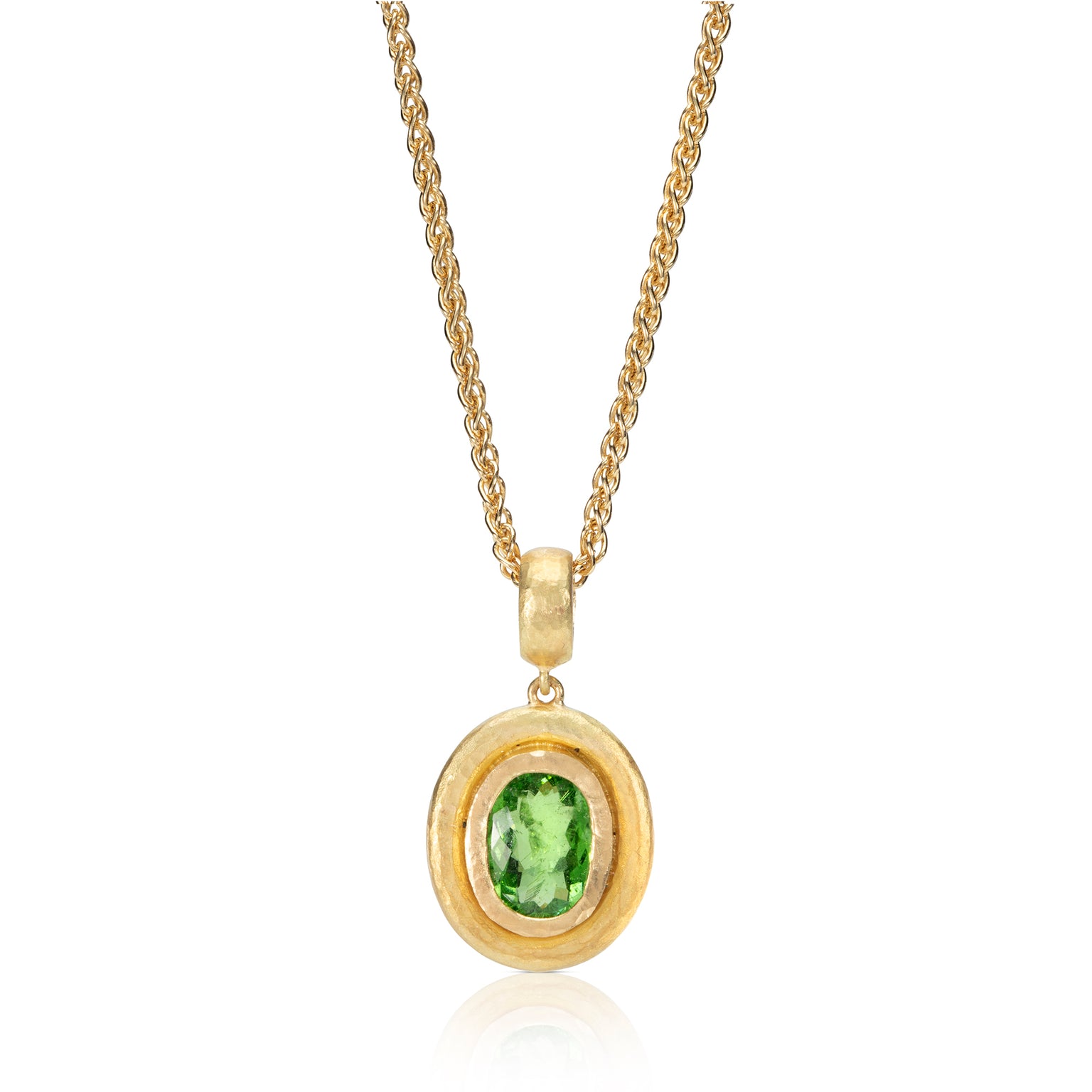 This one-of-a-kind pendant features a rare bright green Paraiba tourmaline, set in solid 18ct yellow gold.