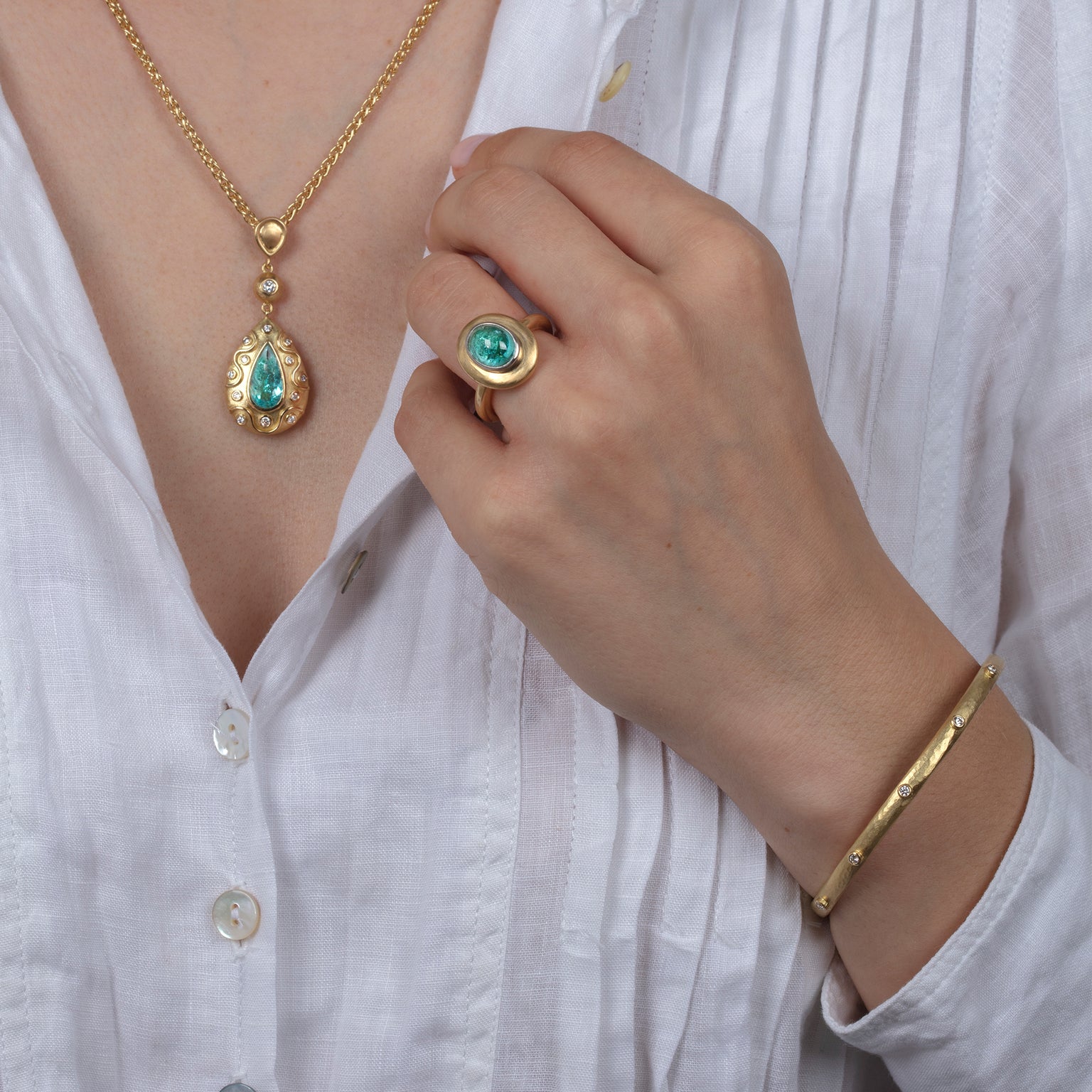 A classic, elegant bangle crafted in rich 18ct yellow gold and finished with a distinctive beaten texture. Featuring five round-cut diamonds, set in secure rub-over settings.